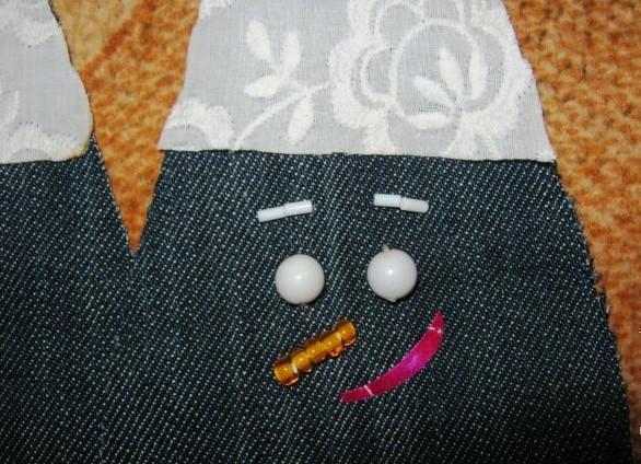 - Kami menyapu tutup celana jeans dan mulai menyulam wajah kecil itu dengan bantuan perhiasan.